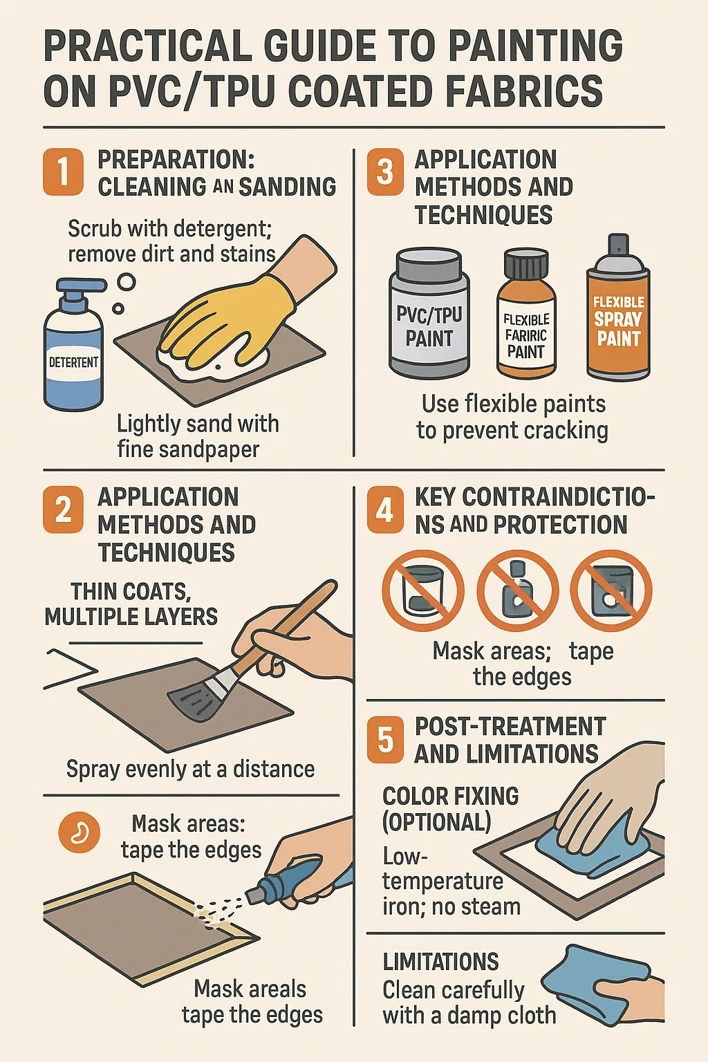 다음은 페인팅에 대한 실제 가이드입니다. PVC 코팅 직물 일반적인 작업 경험과 예방 조치를 통합한 TPU 코팅 직물: