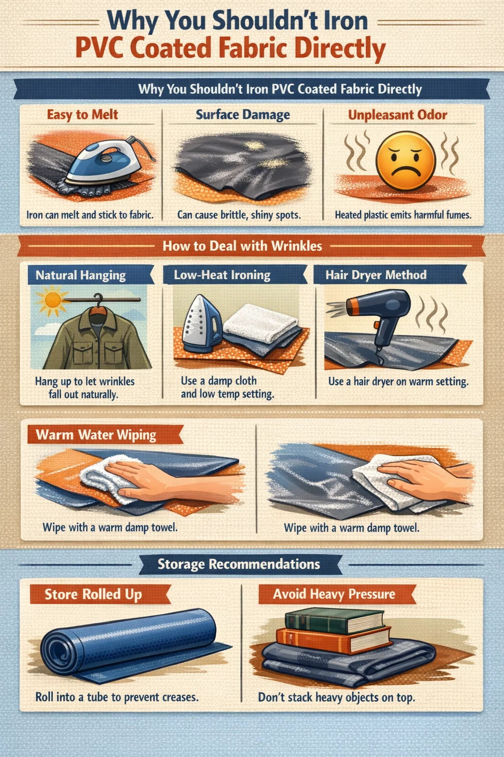 천막을 이용한 저온 다림질: 반드시 다리미를 사용해야 한다면 가장 낮은 온도로 설정하세요. PVC 코팅된 원단 뒷면(코팅되지 않은 면)에 두껍고 축축한 면포를 올려 완충 역할을 합니다. 다리미가 천에 직접 닿지 않도록 하고 다리미를 계속 움직이게 하세요. 절대 한 곳에 두지 마세요.