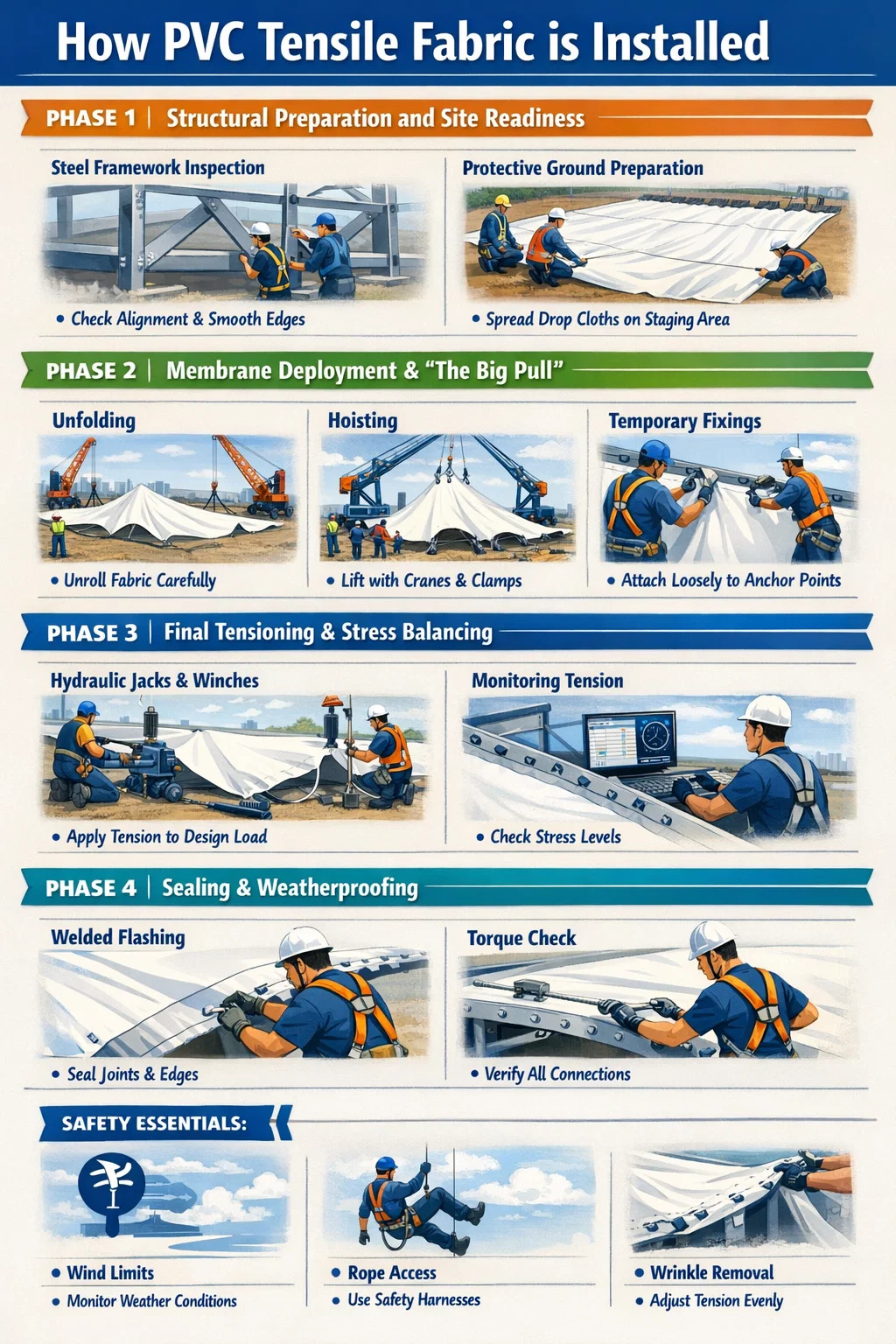 설치 중 PVC 인장 직물 유연한 멤브레인을 견고한 구조적 지붕으로 변환하는 정밀 엔지니어링 프로세스입니다. 기존 지붕과 달리 설치는 다음 사항에 의존합니다. 공학적 긴장 질량보다는. 이 프로세스는 기본 강철 또는 목재 지지 구조를 세우는 것으로 시작하여 직물을 조심스럽게 풀고 주변 고정 장치에 부착한 다음 바람과 눈 하중 저항을 보장하기 위해 재료를 계산된 설계 응력까지 끌어당기는 체계적인 "인장" 단계로 이어집니다.
