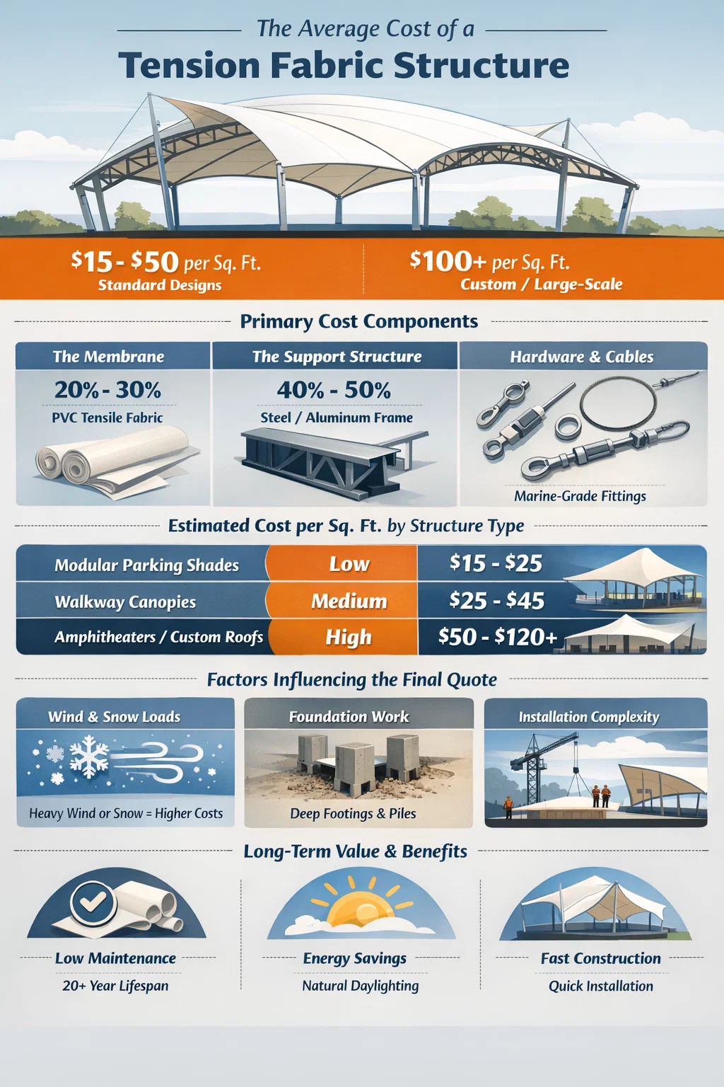 인장 직물 구조의 비용은 일반적으로 다음과 같습니다. 평방피트당 $15~$50 표준 설계의 경우 고도로 맞춤화되거나 대규모 건축 프로젝트의 경우 평방피트당 $100 . 이 가격은 단지 PVC 인장 직물 그 자체; 이는 엔지니어링 강철 프레임워크, 특수 하드웨어, 기초 작업 및 전문 설치 인력을 포함한 완전한 시스템을 포함합니다. 이러한 구조는 특정 바람과 눈 하중을 견딜 수 있도록 맞춤 설계되었기 때문에 가격은 지리적 위치와 설계 복잡성에 따라 변동됩니다.
