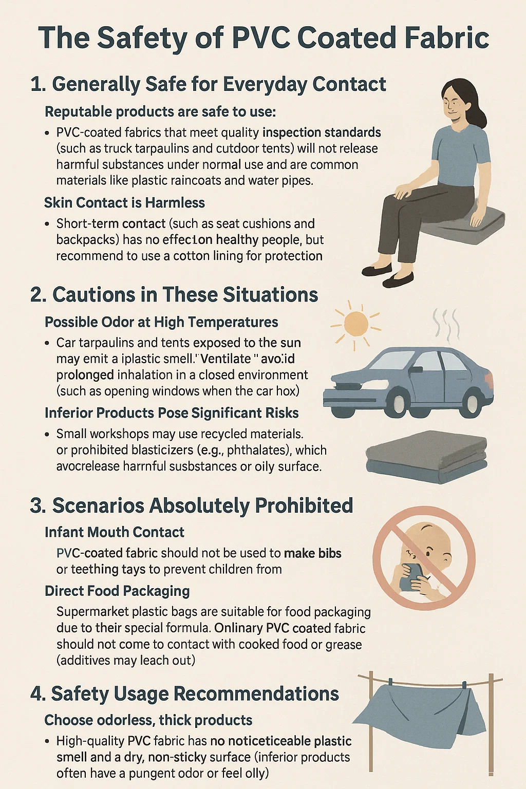 평판이 좋은 제품은 사용해도 안전합니다. PVC 코팅 직물 품질 검사 기준을 충족하는 제품(예: 트럭 방수포, 야외 텐트)은 일반적인 사용 시 유해 물질을 방출하지 않으며 플라스틱 비옷, 수도관과 같은 일반적인 재료입니다.