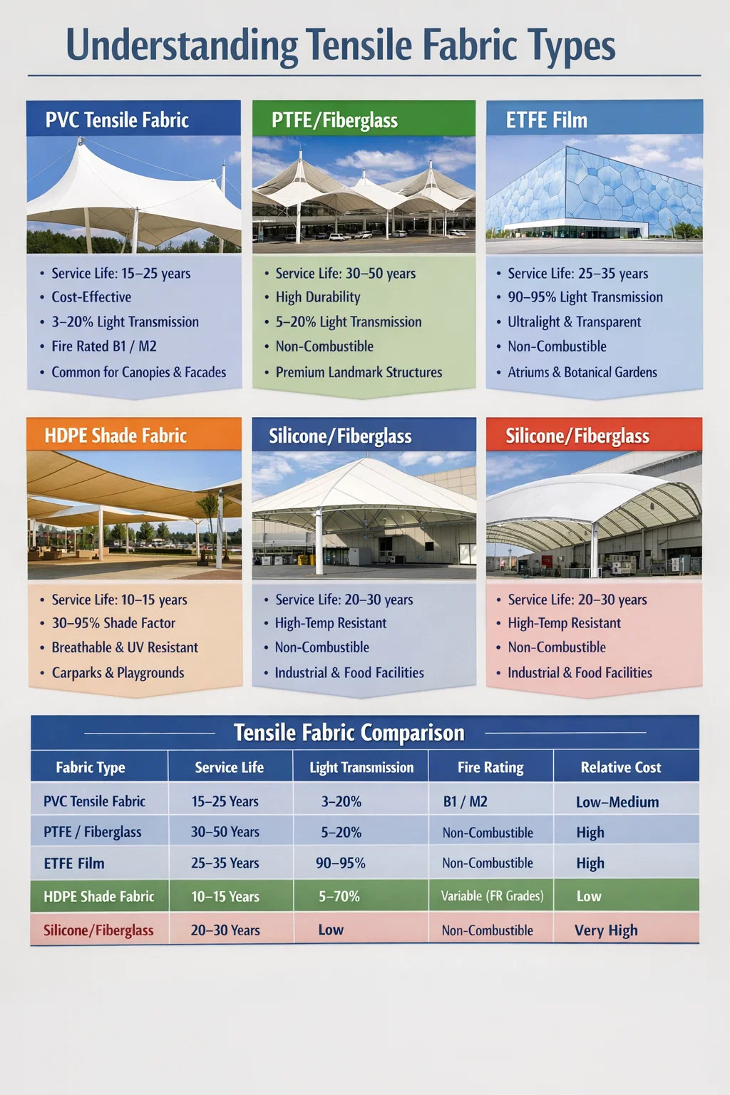 - 예산 및 프로젝트 수명: 설계 수명이 20년 미만이거나 예산이 제한된 경우 PVDF 마감 코팅이 적용된 PVC 인장 직물이 거의 항상 정답입니다. 30년 랜드마크 구조의 경우 PTFE 또는 고급 ETFE가 프리미엄을 정당화합니다.