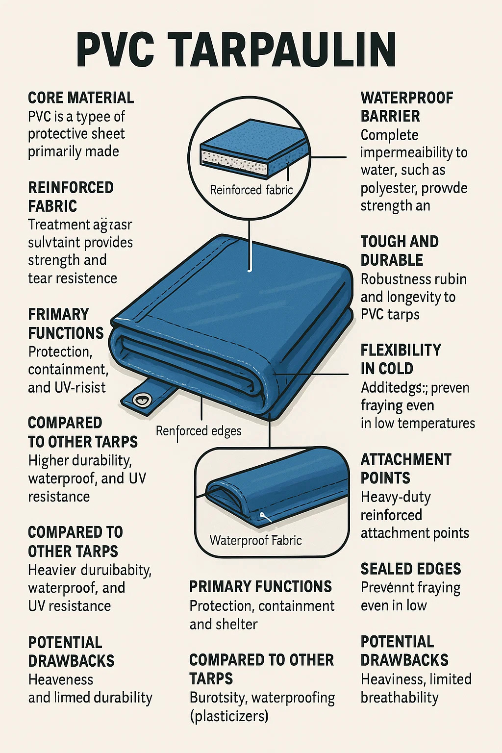 •다른 방수포와 비교: 일반적으로 폴리에틸렌(폴리) 방수포보다 내구성, 방수성 및 UV 저항성이 더 뛰어나지만 더 무겁고 비싼 경향이 있습니다. 캔버스나 비닐 코팅 폴리에스테르 방수포에 비해 특성의 균형이 다릅니다.