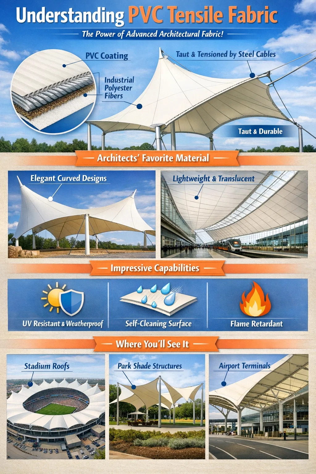PVC 인장 직물 일종의 "놀라울 정도로 강한" 특수 직물로 상상할 수 있습니다. PVC 코팅 직물의 큰 제품군에 속하지만 바람과 비로부터 보호할 뿐만 아니라 상당한 스트레스를 견딜 수 있도록 설계되었습니다.