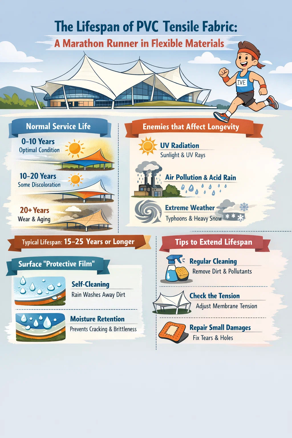수명에 관해서는 PVC 인장 직물 간단히 말해서, 그것은 상당한 기간 동안 건물을 동반할 수 있는 첨단 기술의 "껍질"과 같습니다. 벽돌이나 타일처럼 백년을 버틸 수는 없겠지만, 유연한 소재의 세계에서는 확실히 오래 지속되는 '마라톤 주자'이다.